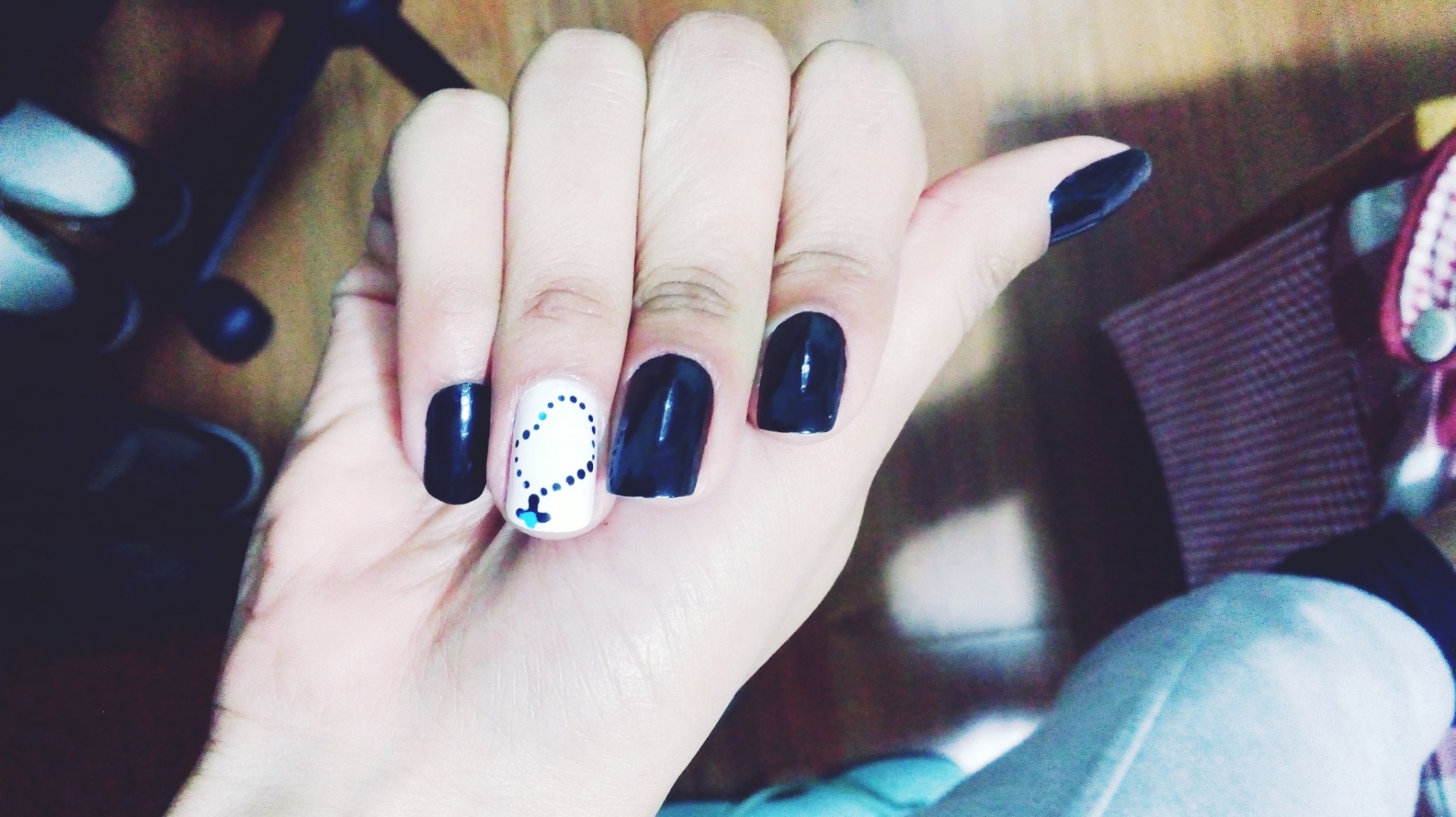A nail art pode combinar com a roupa ou mesmo com o estilo da pessoa. Meu caso foi um exemplo, para combinar com o meu humor, pintei as unhas de cor preta (risos), e como eu estava voltada para o espiritualismo, quis desenhar o terço!